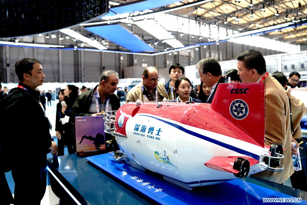SHANGHAI, 3 décembre (Xinhua) -- Des visiteurs admirent une maquette du submersible habité Shenhai Yongshi (Guerrier des profondeurs marines) à l'exposition Marintec China 2025 au Nouveau Centre international des expositions de Shanghai, dans l'est de la Chine, le 2 décembre 2025. Attirant plus de 2.200 entreprises de 16 pays et régions, l'événement a débuté mardi et se poursuivra jusqu'au 5 décembre 2025. (Photo : Zhang Jiansong)