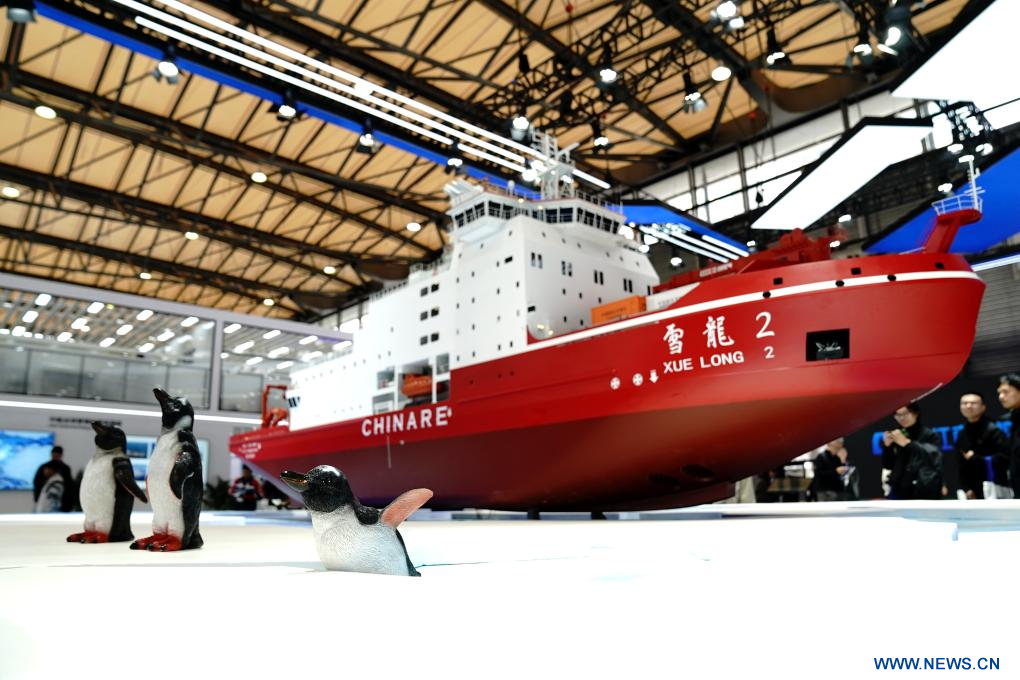 SHANGHAI, 3 décembre (Xinhua) -- Des visiteurs admirent une maquette du brise-glace chinois Xuelong 2, ou Dragon des neiges 2, dédié à la recherche polaire, à l'exposition Marintec China 2025 au Nouveau Centre international des expositions de Shanghai, dans l'est de la Chine, le 2 décembre 2025. Attirant plus de 2.200 entreprises de 16 pays et régions, l'événement a débuté mardi et se poursuivra jusqu'au 5 décembre 2025. (Photo : Zhang Jiansong)