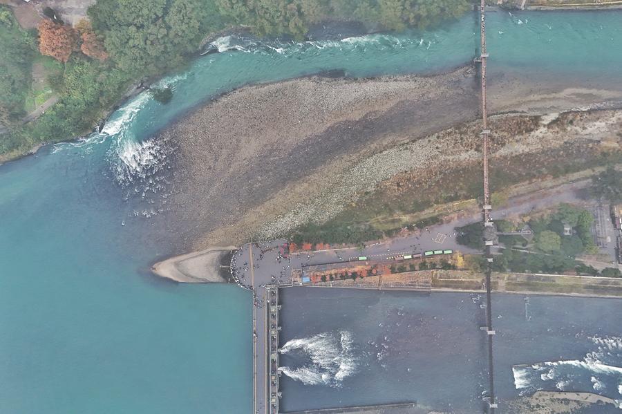 Vue aérienne du pont Nanqiao sur le canal intérieur dans la zone touristique de Dujiangyan à Chengdu, capitale de la province chinoise du Sichuan (sud-ouest), le 6 décembre 2025. (Photo : Liu Kun)Vue aérienne du canal intérieur (à gauche), et Feishayan, un des trois grands composants du système d'irrigation de Dujiangyan, dans la ville de Dujiangyan à Chengdu, capitale de la province chinoise du Sichuan (sud-ouest), le 6 décembre 2025. (Photo : Liu Kun)Vue aérienne de Baopingkou, une entrée d'eau creusée artificiellement, dans la zone touristique de Dujiangyan à Chengdu, capitale de la province chinoise du Sichuan (sud-ouest), le 30 novembre 2025. (Photo : Xu Bingjie)Vue aérienne de la "bouche de poisson", un barrage de déviation de l'eau, dans la ville de Dujiangyan à Chengdu, capitale de la province chinoise du Sichuan (sud-ouest), le 6 décembre 2025. (Photo : Liu Kun)Vue aérienne du canal intérieur et d'une rue vieille de 700 ans dans la ville de Dujiangyan à Chengdu, capitale de la province chinoise du Sichuan (sud-ouest), le 6 décembre 2025. (Photo : Liu Kun)■