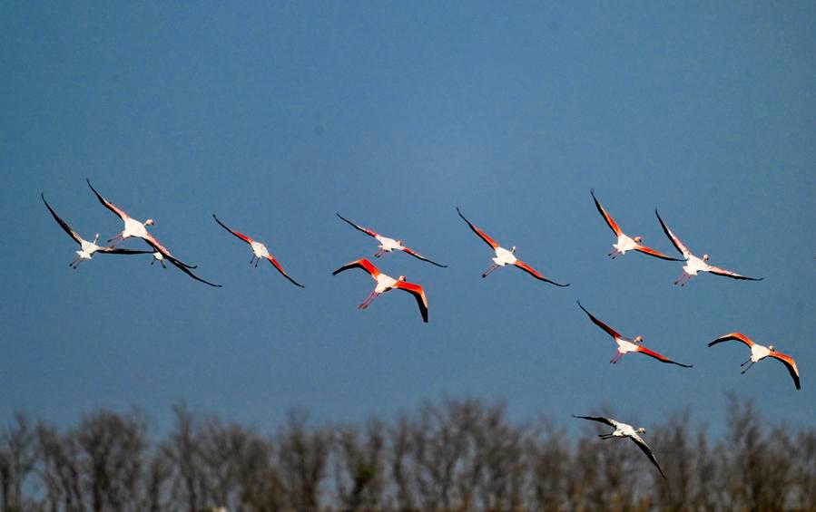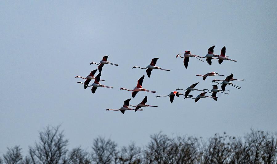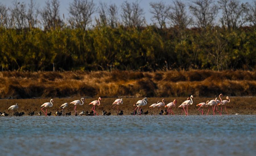 NANJING, 9 décembre (Xinhua) -- Récemment, une colonie de flamants roses s'est installée dans la zone humide Tiaozini à Dongtai, dans la ville de Yancheng de la province du Jiangsu (est de la Chine), pour hiverner. Les flamants roses y migrent chaque hiver depuis 2015, soit 11 années consécutives.