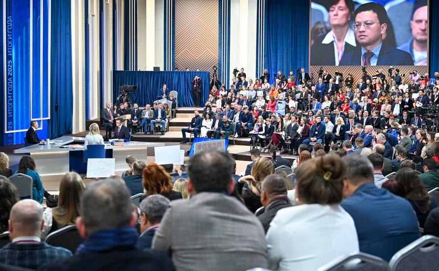 Le président russe Vladimir Poutine s'exprime lors de sa conférence de presse annuelle de fin d'année à Moscou, en Russie, le 19 décembre 2025. (Xinhua/Hao Jianwei)Le président russe Vladimir Poutine (au centre) s'exprime lors de sa conférence de presse annuelle de fin d'année à Moscou, en Russie, le 19 décembre 2025. (Xinhua/Hao Jianwei)Le président russe Vladimir Poutine répond à une question d'un journaliste de Xinhua lors de sa conférence de presse annuelle de fin d'année à Moscou, en Russie, le 19 décembre 2025. (Xinhua/Hao Jianwei)Deux personnes dans une rue de Moscou, en Russie, regardent un écran diffusant la conférence de presse annuelle de fin d'année du président russe Vladimir Poutine, le 19 décembre 2025. (Xinhua/Hao Jianwei)
