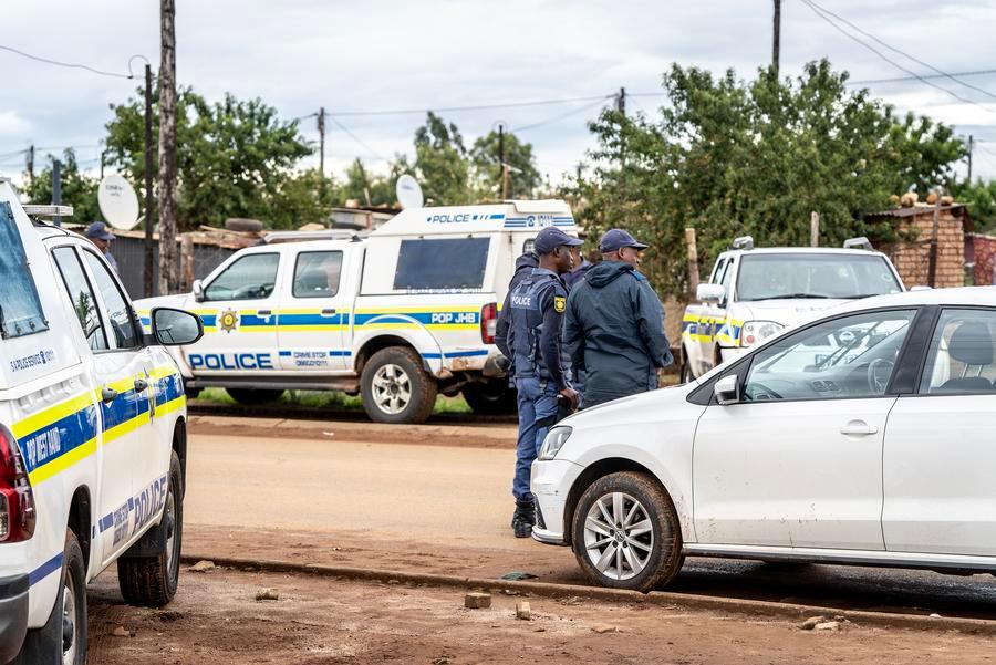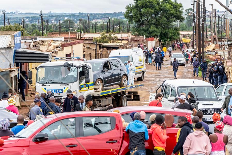 Des policiers travaillent sur les lieux d'une fusillade à Bekkersdal, près de Johannesburg, en Afrique du Sud, le 21 décembre 2025. Au moins neuf personnes ont été tuées et dix autres blessées lors d'une fusillade dans ledistrict de Bekkersdal, près de Johannesburg, la plus grande ville et le centre économique de l'Afrique du Sud, a déclaré dimanche la police locale. (Xinhua/Shiraaz Mohamed)
