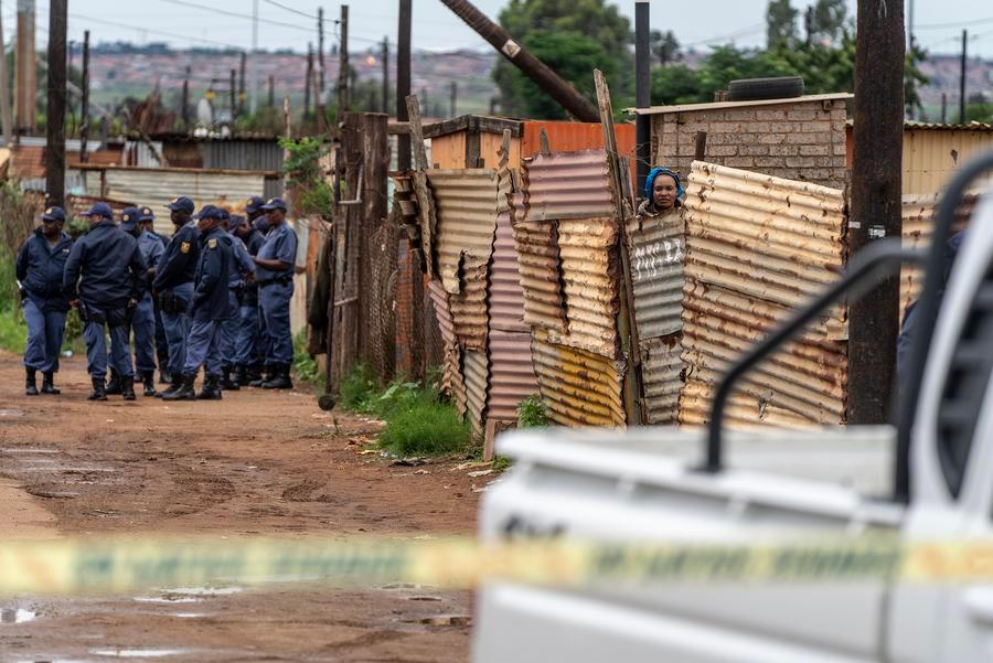 Les forces de police ont bouclé le lieu d'une fusillade à Bekkersdal, en Afrique du Sud, le 21 décembre 2025. Au moins neuf personnes ont été tuées et dix autres blessées lors d'une fusillade dans le district de Bekkersdal, près de Johannesburg, la plus grande ville et le centre économique de l'Afrique du Sud, a déclaré dimanche la police locale. (Xinhua/Shiraaz Mohamed)