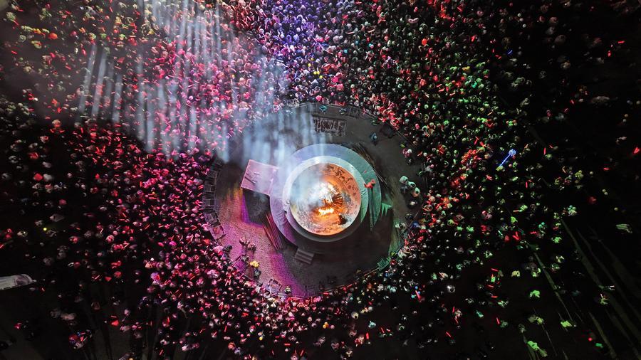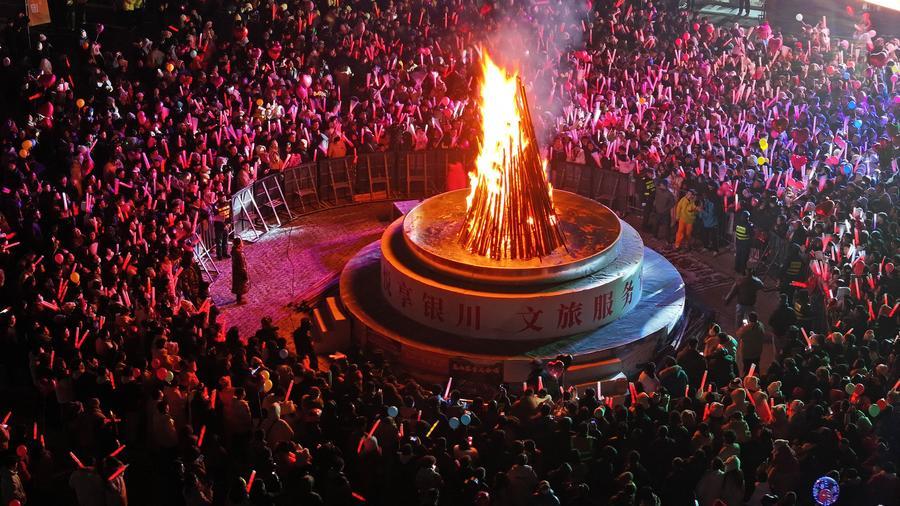 Des gens rassemblés autour d'un feu de joie pour célébrer le Nouvel An au parc de Lanshan à Yinchuan, dans la région autonome Hui du Ningxia (nord-ouest de la Chine), le 31 décembre 2025. (Photo : Wang Peng)