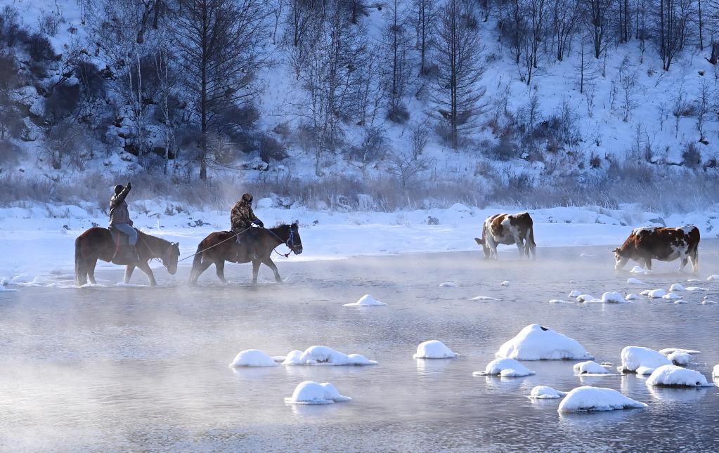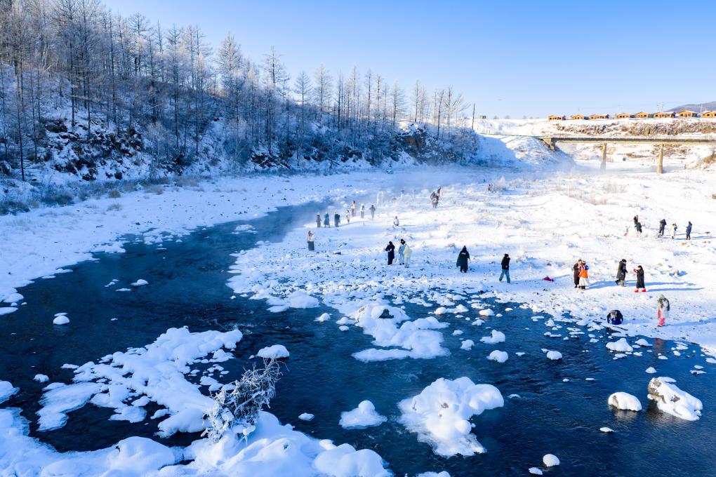 Malgré le froid glacial de l'hiver à Arxan, cette partie de la rivière Halha, influencée par la géothermie, ne gèle jamais, ce qui attire un grand nombre de touristes en hiver. (Photo : Ma Jinrui)
