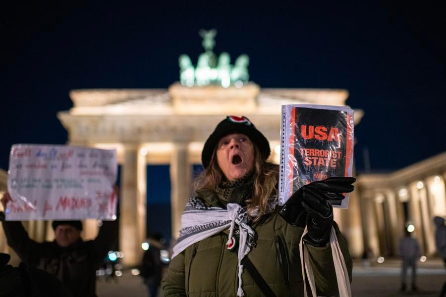 LONDRES, 7 janvier (Xinhua) -- Des manifestants protestent contre l'action militaire américaine contre le Venezuela devant le 10 Downing Street à Londres, au Royaume-Uni, le 5 janvier 2026. (Xinhua/Ray Tang)Des manifestants protestent contre l'action militaire américaine contre le Venezuela à la porte de Brandebourg à Berlin, en Allemagne, le 5 janvier 2026. (Xinhua/Zhang Haofu)Des manifestants protestent contre l'action militaire américaine contre le Venezuela à Rabat, au Maroc, le 5 janvier 2026. (Xinhua/Aissa)Des manifestants protestent contre l'action militaire américaine contre le Venezuela devant l'ambassade des Etats-Unis à Colombo, au Sri Lanka, le 6 janvier 2026. (Xinhua/Gayan Sameera)Des personnes protestent contre l'action militaire américaine contre le Venezuela, devant l'ambassade des Etats-Unis à Jakarta, en Indonésie, le 6 janvier 2026. (Xinhua/Agung Kuncahya B.)■