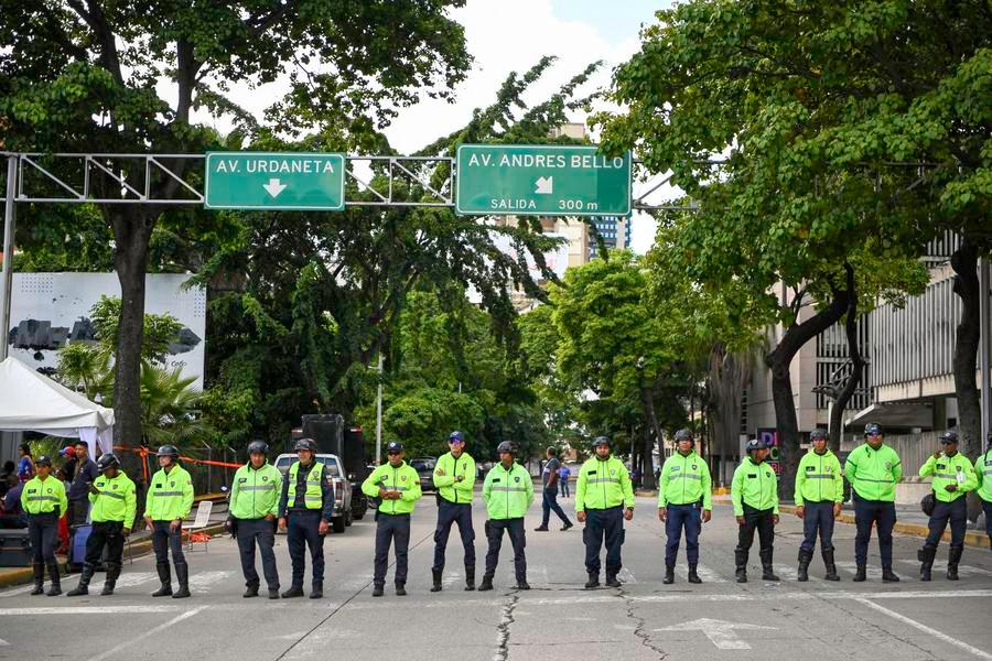 CARACAS, 9 janvier (Xinhua) -- Des personnes participent à une manifestation à Caracas, au Venezuela, le 8 janvier 2026. Une manifestation a eu lieu jeudi dans la capitale vénézuélienne, au cours de laquelle de jeunes Vénézuéliens ont demandé au gouvernement américain de libérer le président vénézuélien Nicolas Maduro et son épouse. (Xinhua/Ding Hongfa)CARACAS, 9 janvier (Xinhua) -- Des membres de la garde nationale vénézuélienne montent la garde lors d'une manifestation à Caracas, au Venezuela, le 8 janvier 2026. Une manifestation a eu lieu jeudi dans la capitale vénézuélienne, au cours de laquelle de jeunes Vénézuéliens ont demandé au gouvernement américain de libérer le président vénézuélien Nicolas Maduro et son épouse. (Xinhua/Ding Hongfa)