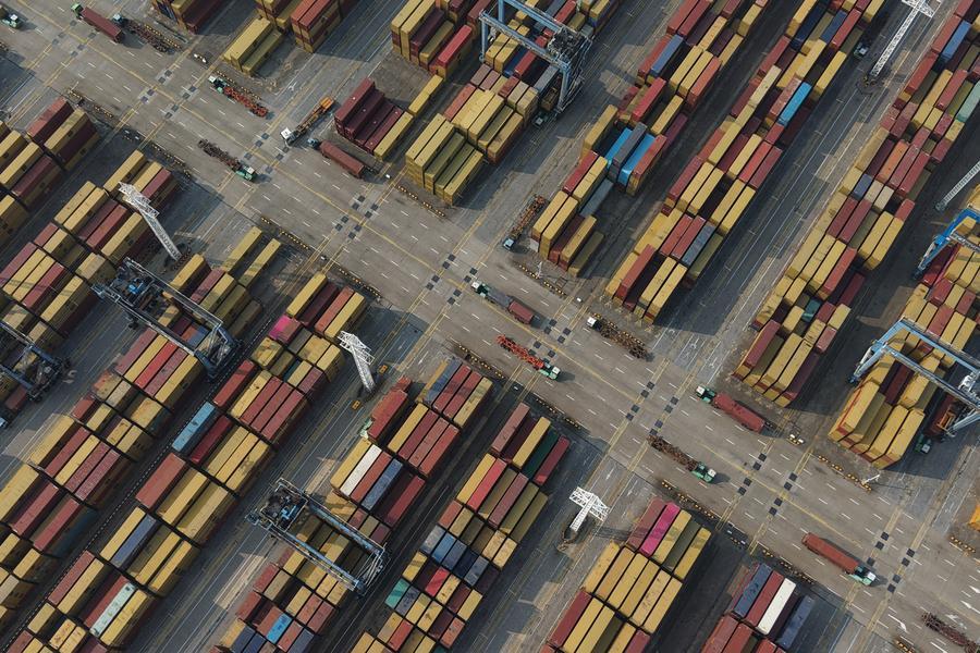 Photo aérienne prise par un drone montrant un terminal à conteneurs dans la zone de Chuanshan du port de Ningbo-Zhoushan, dans la province chinoise du Zhejiang (est), le 8 janvier 2026.(Photo : Huang Zongzhi)