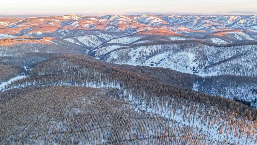 Photo aérienne prise par drone le 10 janvier 2026 montrant le paysage hivernal de la réserve naturelle nationale de Saihanba, à Chengde, dans la province chinoise du Hebei (nord). (Photo : Liu Mancang)