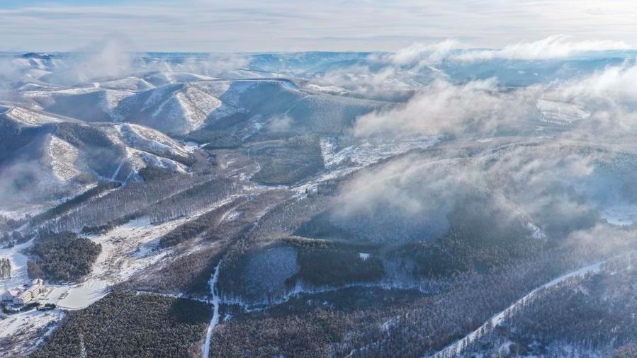 CHENGDE, 10 janvier (Xinhua) -- Photo aérienne prise par drone le 10 janvier 2026 montrant le paysage hivernal de la réserve naturelle nationale de Saihanba, à Chengde, dans la province chinoise du Hebei (nord).