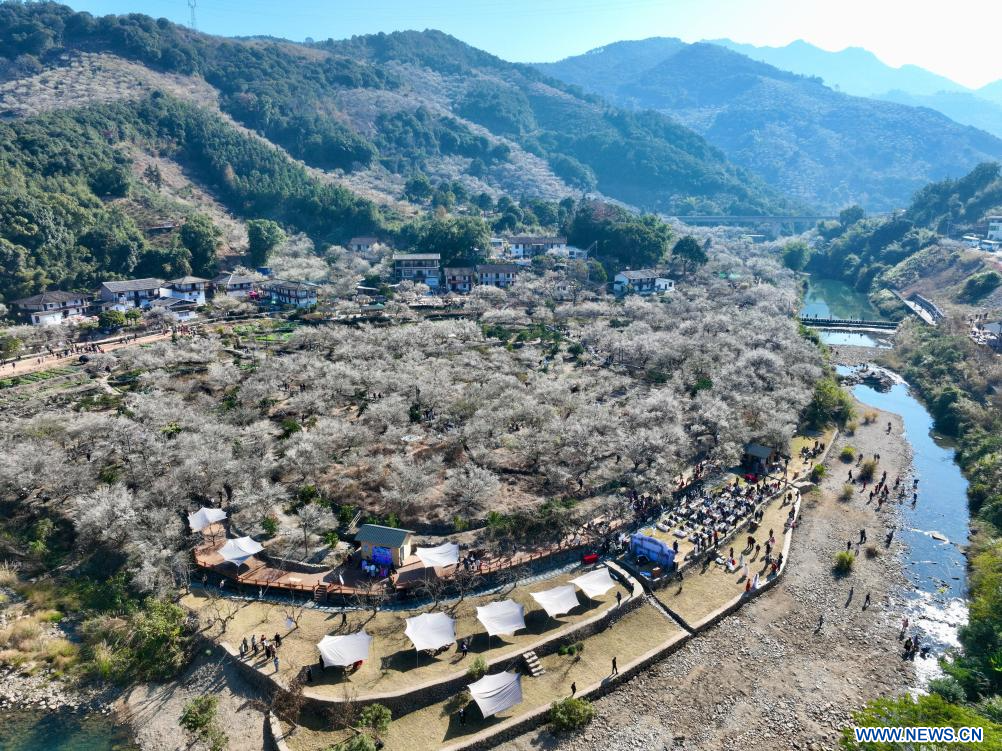 YONGTAI, 11 janvier (Xinhua) -- Photo aérienne prise par un drone de touristes admirant des pruniers en fleurs dans le district de Yongtai de la province chinoise du Fujian (sud-est), le 10 janvier 2026. Le festival annuel des pruniers en fleurs a débuté samedi et devrait promouvoir le tourisme local et mettre en valeur la beauté naturelle du district à travers diverses activités culturelles. (Photo : Jiang Kehong)