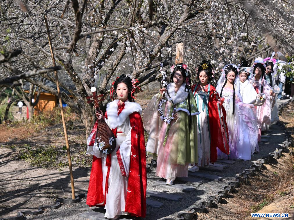 YONGTAI, 11 janvier (Xinhua) -- De jeunes femmes portant des vêtements traditionnels chinois visitent un jardin de pruniers en fleurs du district de Yongtai, dans la province chinoise du Fujian (sud-est), le 10 janvier 2026. Le festival annuel des pruniers en fleurs a débuté samedi et devrait promouvoir le tourisme local et mettre en valeur la beauté naturelle du district à travers diverses activités culturelles. (Photo : Jiang Kehong)