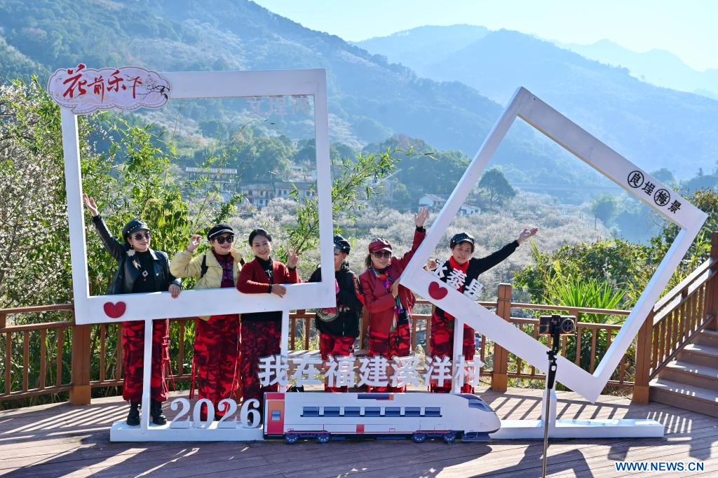 YONGTAI, 11 janvier (Xinhua) -- Des touristes posent pour des photos dans le district de Yongtai de la province chinoise du Fujian (sud-est), le 10 janvier 2026. Le festival annuel des pruniers en fleurs a débuté samedi et devrait promouvoir le tourisme local et mettre en valeur la beauté naturelle du district à travers diverses activités culturelles. (Photo : Jiang Kehong)