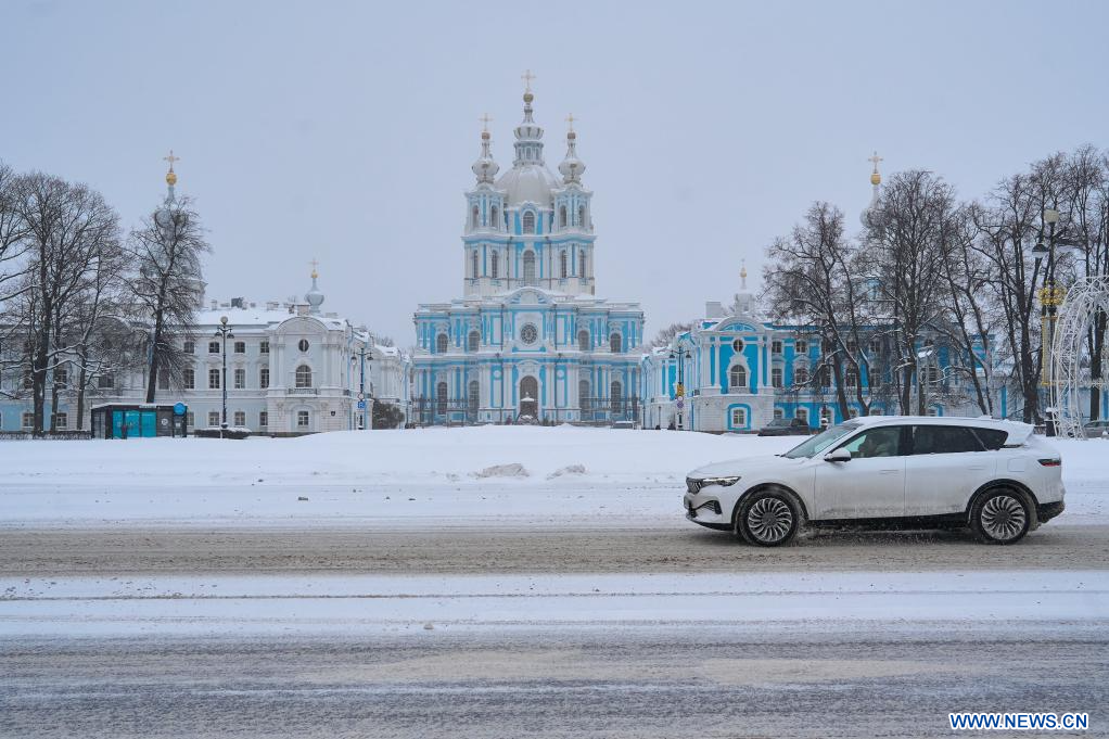 SAINT-PETERSBOURG, 11 janvier (Xinhua) -- Une voiture passe devant la cathédrale de Smolny à Saint-Pétersbourg, en Russie, le 10 janvier 2026. (Xinhua/Guo Feizhou)