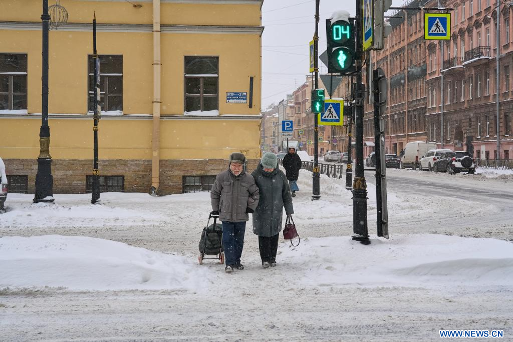 SAINT-PETERSBOURG, 11 janvier (Xinhua) -- Des passants dans une rue enneigée de Saint-Pétersbourg, en Russie, le 10 janvier 2026. (Xinhua/Guo Feizhou)