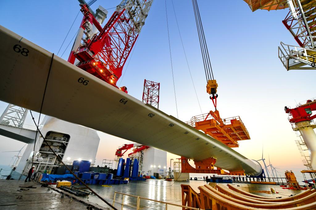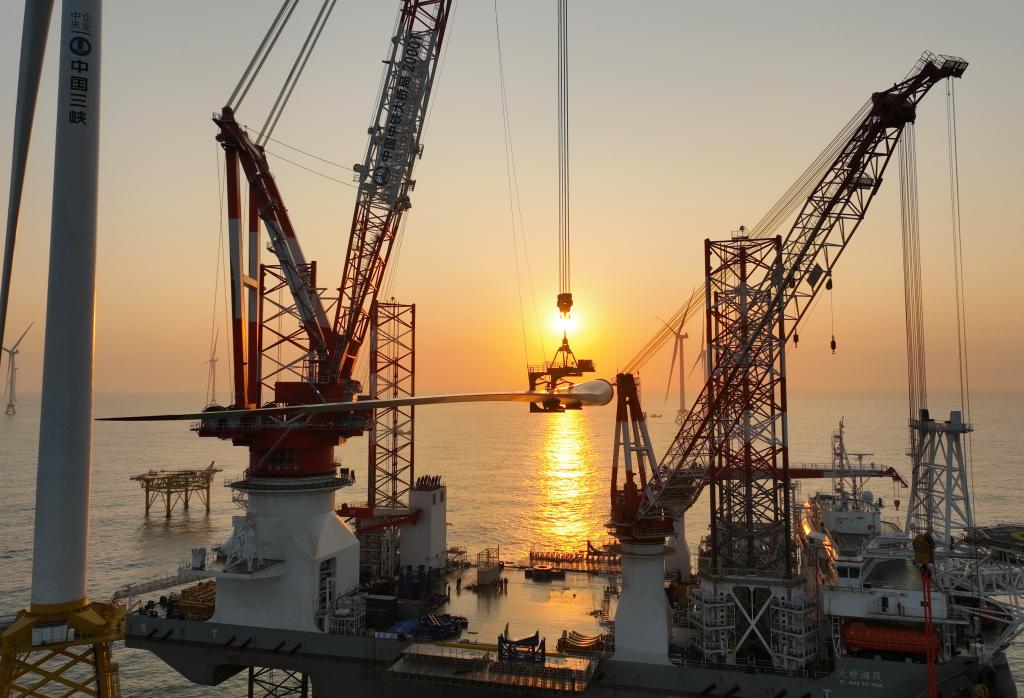 ZHANGZHOU, 13 janvier (Xinhua) -- Cette photo prise par un drone montre l'une des pales d'éolienne en cours de levage sur le chantier de construction d'une éolienne offshore de 20 mégawatts dans les eaux côtières de la province chinoise du Fujian (sud-est), le 13 janvier 2026. (Photo : Lin Shanchuan)