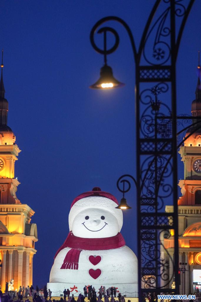 HARBIN, 17 janvier (Xinhua) -- Photo prise le 10 janvier 2026 montrant un bonhomme de neige géant dans un site touristique de Harbin, dans la province du Heilongjiang, dans le nord-est de la Chine. Avec l'arrivée de la saison des glaces et des neiges, diverses installations publiques de la province du Heilongjiang ont créé des paysages à thème originaux autour du bonhomme de neige pour attirer les habitants et les touristes. (Photo : Wang Jianwei)