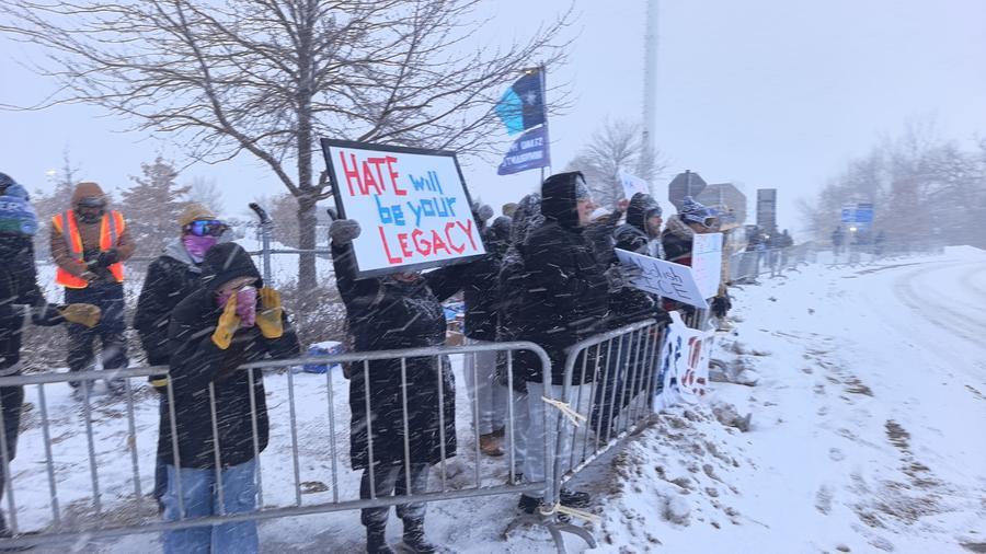 MINNEAPOLIS, 22 janvier (Xinhua) -- Des manifestants participent à une manifestation devant le bâtiment fédéral Bishop Henry Whipple à Minneapolis, dans le Minnesota, aux Etats-Unis, le 21 janvier 2026. La mort par balle d'une Américaine par un agent de l'Immigration et des Douanes américaines (ICE) à Minneapolis continue d'attiser les tensions locales et nationales, les responsables étatiques et fédéraux s'opposant vivement sur le déroulement des faits et la manière dont l'incident devrait être géré. (Xinhua)