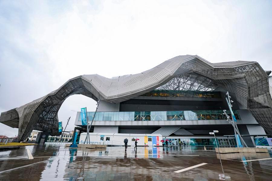 Photo prise le 28 janvier 2026 montrant une façade du Centre principal des médias pour les Jeux olympiques d'hiver 2026 de Milan Cortina à Milan, en Italie. (Xinhua/Hu Xingyu)