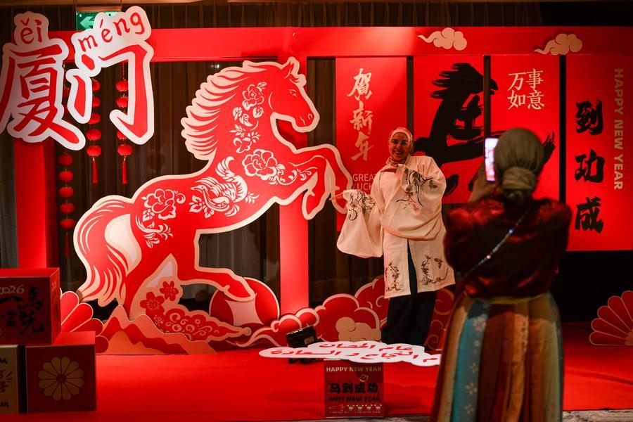 Des personnes prennent des photos lors d'un événement de promotion culturelle et touristique pour la ville de Xiamen, dans la province chinoise du Fujian (sud-est), au Caire, en Egypte, le 29 janvier 2026. (Xinhua/Xin Mengchen)