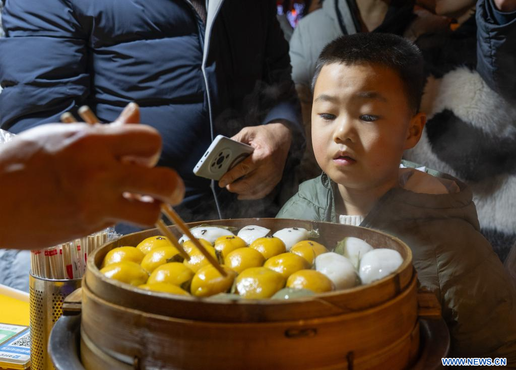 CHONGQING, 6 février (Xinhua) -- Un enfant est intrigué par des mets à une foire consacrée aux produits du Nouvel An chinois, à Chongqing, dans le sud-ouest de la Chine, le 5 février 2026.
