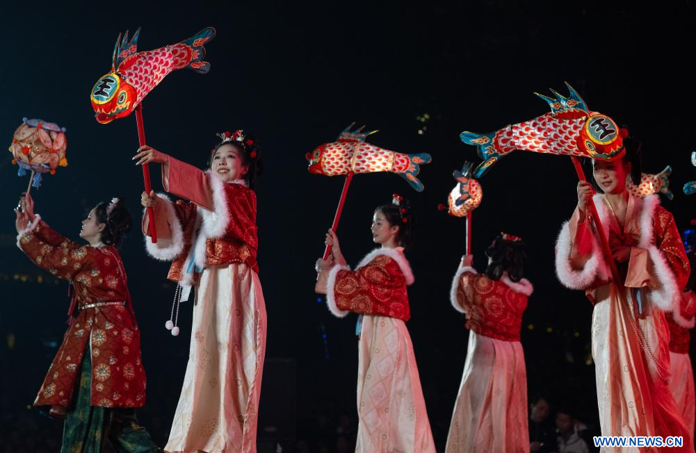 CHONGQING, 6 février (Xinhua) -- Des artistes donnent un spectacle lors de la cérémonie d'ouverture d'une foire consacrée aux produits du Nouvel An chinois, à Chongqing, dans le sud-ouest de la Chine, le 5 février 2026.