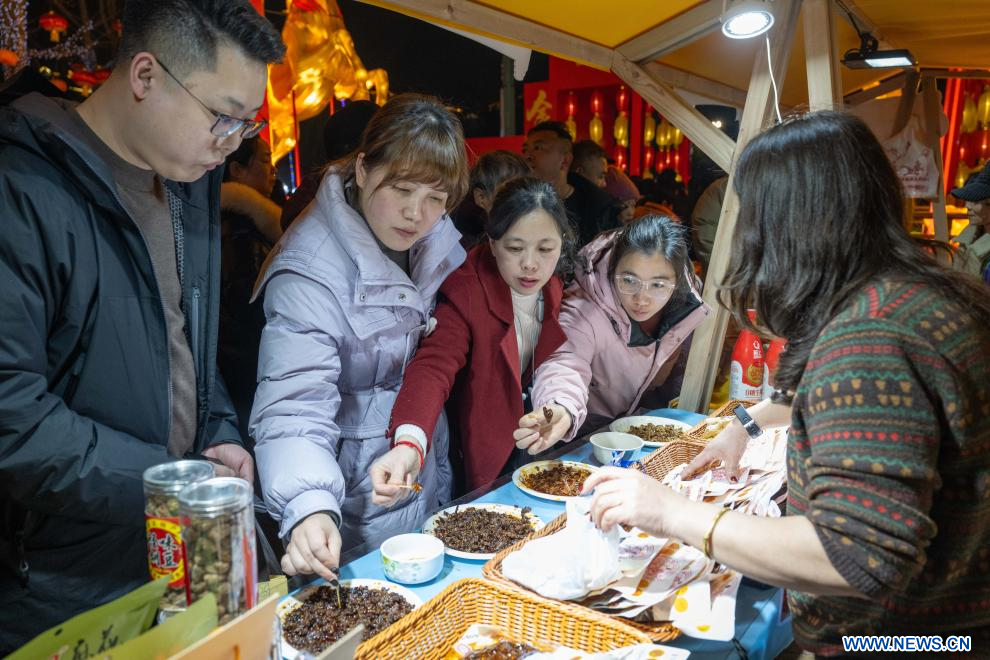 CHONGQING, 6 février (Xinhua) -- Des personnes devant un stand à une foire consacrée aux produits du Nouvel An chinois, à Chongqing, dans le sud-ouest de la Chine, le 5 février 2026.