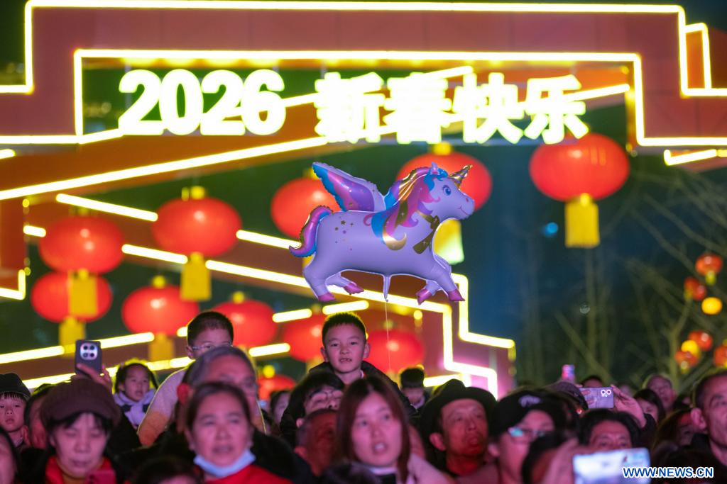 CHONGQING, 6 février (Xinhua) -- Des personnes assistent à des spectacles lors de la cérémonie d'ouverture d'une foire consacrée aux produits du Nouvel An chinois, à Chongqing, dans le sud-ouest de la Chine, le 5 février 2026.