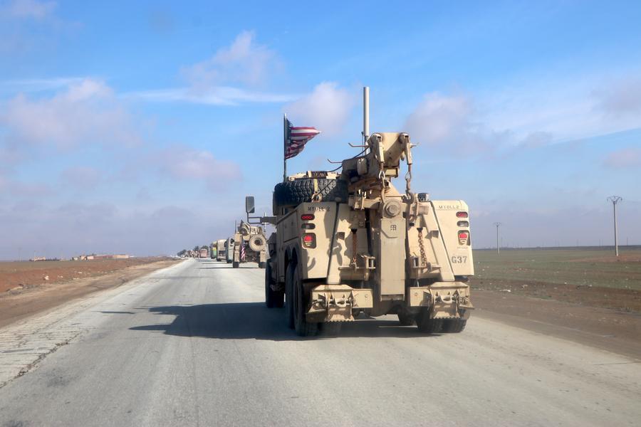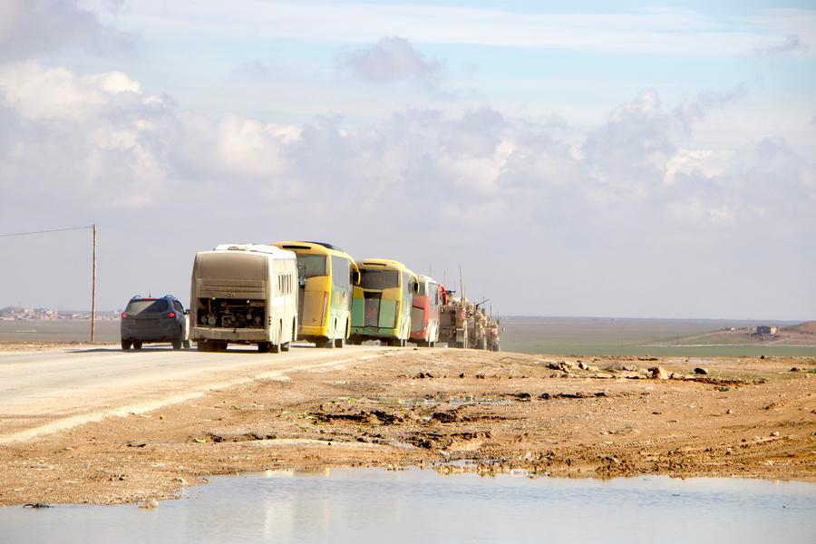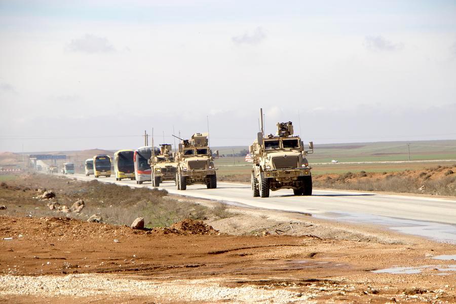 HASAKAH, 8 février (Xinhua) -- Des véhicules militaires américains escortent des bus transportant des détenus de l'Etat islamique (EI) du nord-est de la Syrie vers l'Irak, le 8 février 2026. L'Irak a accueilli 2.250 détenus de l'EI provenant de Syrie et a entamé des procédures de classification juridique à leur encontre, a déclaré samedi l'armée irakienne. (Xinhua/Str)