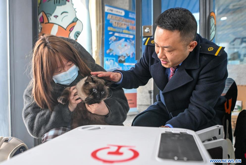 CHONGQING, 11 février (Xinhua) -- Une passagère met son animal de compagnie dans une cage de transport dédiée aux animaux dans la municipalité de Chongqing, dans le sud-ouest de la Chine, le 9 février 2026. Les autorités ferroviaires de Chongqing ont lancé un service pilote de transport d'animaux de compagnie sur les trains à grande vitesse sur certaines lignes durant la période du pic des voyages de la fête du Printemps.