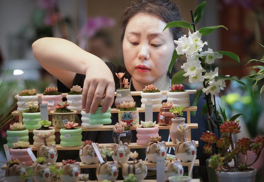 Une vendeuse prépare des plantes lors d'une foire aux fleurs et aux cadeaux du Nouvel An chinois au centre Aberdeen à Richmond, en Colombie-Britannique, au Canada, le 12 février 2026. (Xinhua/Liang Sen)