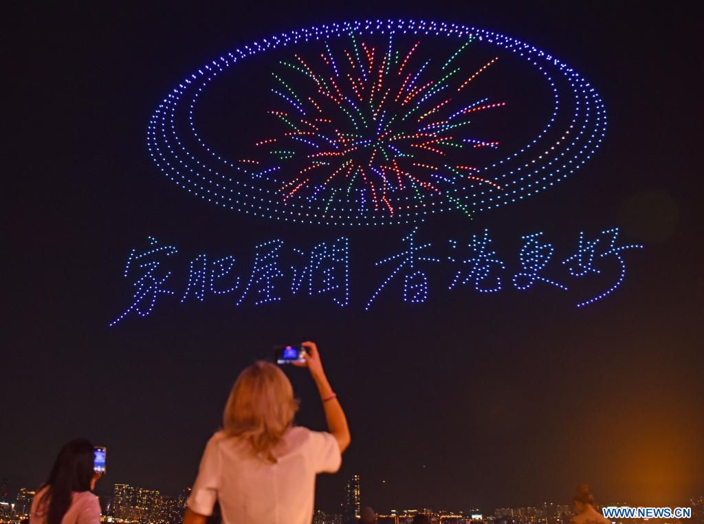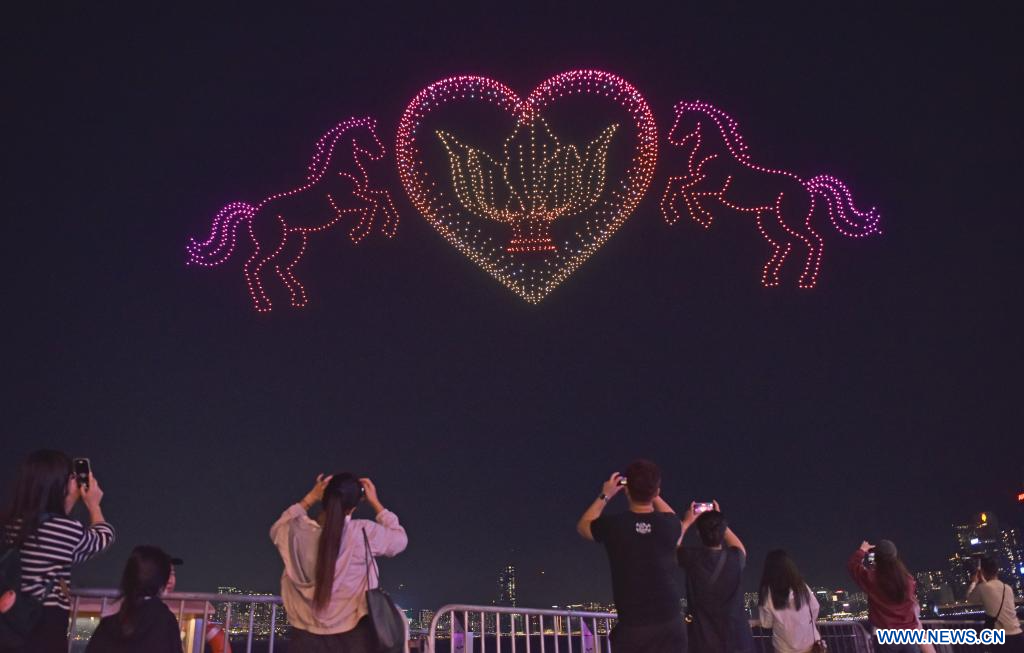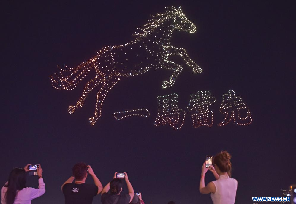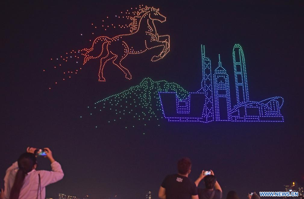 HONG KONG, 15 février (Xinhua) -- Un spectacle de drones lumineux pour célébrer le Nouvel An chinois à Hong Kong, dans le sud de la Chine, le 14 février 2026. (Photo : Chen Duo)