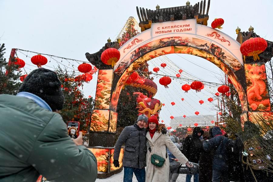 MOSCOU, 17 février (Xinhua) -- Des visiteurs admirent les décorations en célébration du Nouvel An chinois à Moscou, en Russie, le 16 février 2026. (Xinhua/Alexander Zemlianichenko Jr)