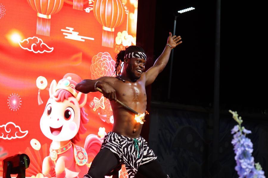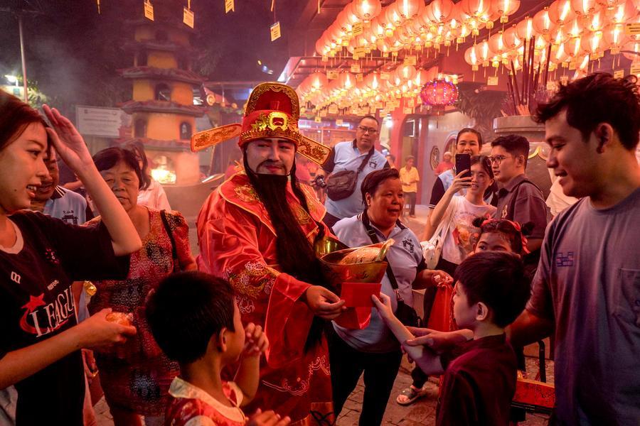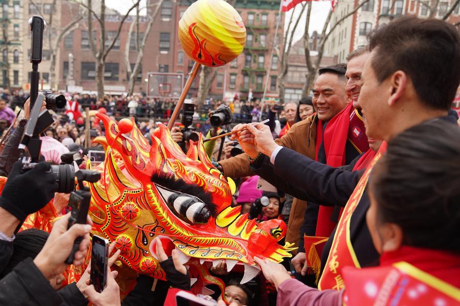 Des personnes apportent la touche finale à une tête de dragon destinée aux danses du dragon lors d'une célébration marquant le Nouvel An chinois à Chinatown, à New York, aux Etats-Unis, le 17 février 2026. La célébration marquant le Nouvel An chinois s'est tenue mardi, attirant des milliers de personnes avec des pétards, des danses du dragon et du lion et d'autres spectacles. (Xinhua/Zhang Fengguo)La Tour nationale du Canada (CN Tower) à Toronto est illuminée en rouge pour célébrer le Nouvel An chinois, le 17 février 2026. (Xinhua/Zou Zheng)Un spectacle de danse traditionnelle ghanéenne est présenté lors d'un gala marquant le Nouvel An chinois à Tema, dans la région du Grand Accra, au Ghana, le 16 février 2026. (Xinhua/Seth)Des enfants se servent de baguettes lors d'un jeu en célébration du Nouvel An chinois dans une école primaire de Gaborone, la capitale du Botswana, le 17 février 2026. (Xinhua/Tshekiso Tebalo)Une femme vêtue en costume traditionnel chinois assiste à une célébration du Nouvel An chinois dans le quartier chinois de Buenos Aires, capitale de l'Argentine, le 16 février 2026. (Xinhua/Zhang Duo)Un homme déguisé en dieu de la fortune participe aux célébrations du réveillon du Nouvel An chinois à Tangerang, dans la province de Banten, en Indonésie, le 16 février 2026. (Xinhua/B. Nugraha)