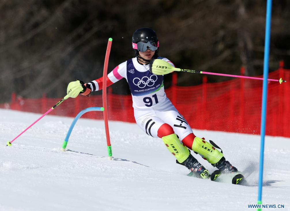 CORTINA D'AMPEZZO (Italie), 18 février (Xinhua) -- Eloise Yung Shih King de Hong Kong (Chine), participe à la première manche du ski alpin slalom femmes aux Jeux olympiques d'hiver de Milan Cortina 2026, à Cortina, en Italie, le 18 février 2026. (Xinhua/Zhang Chenlin)