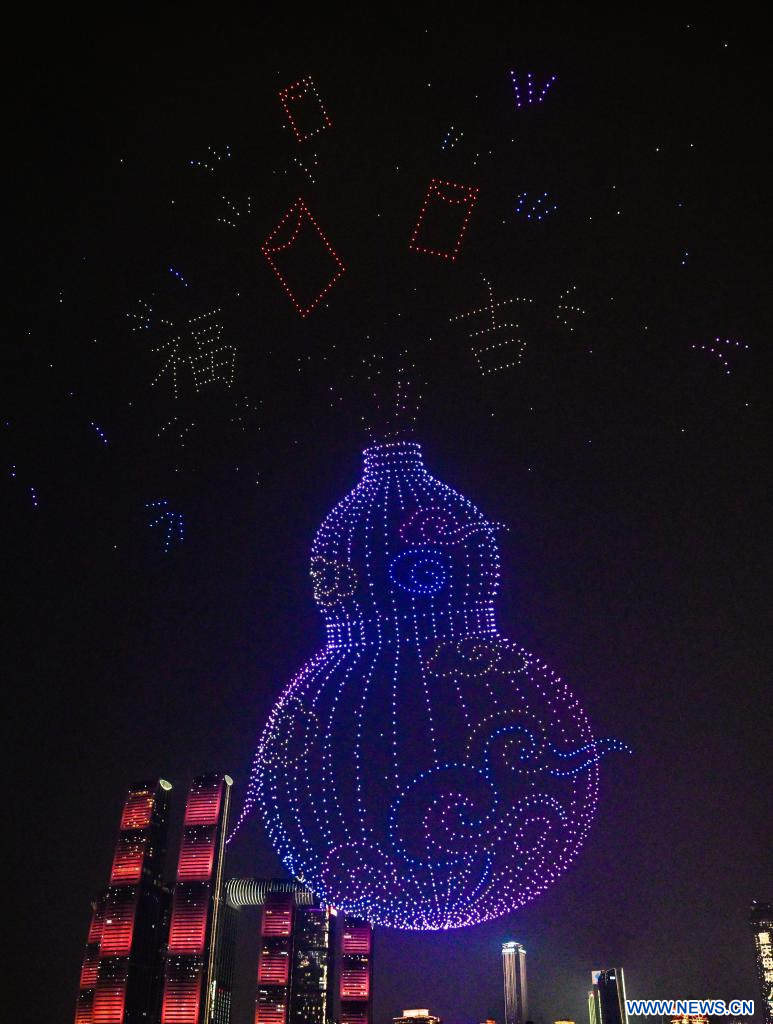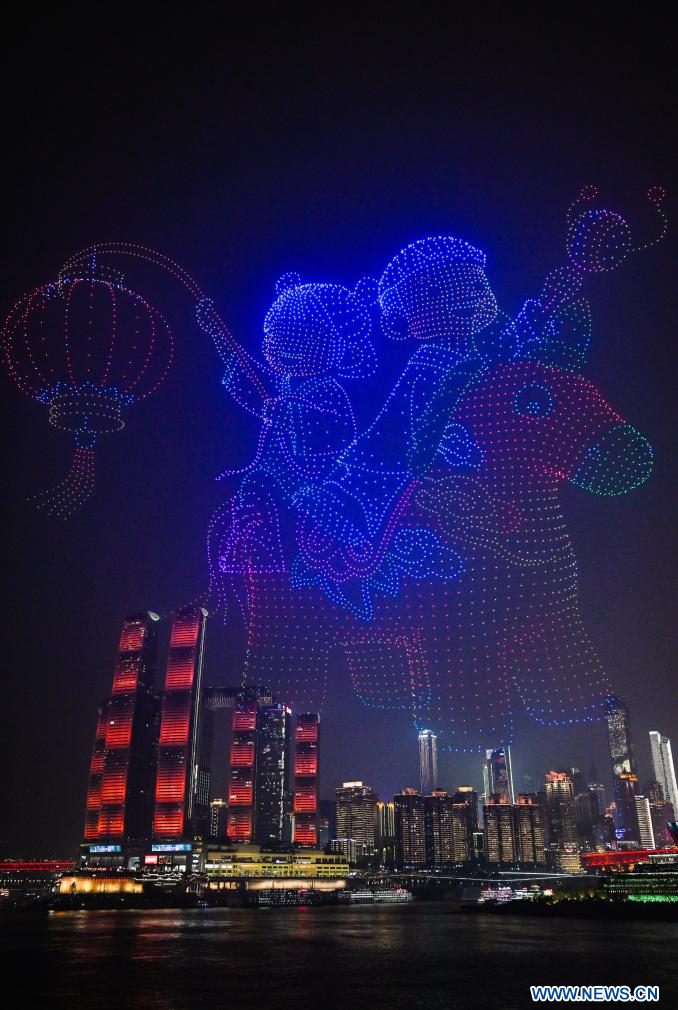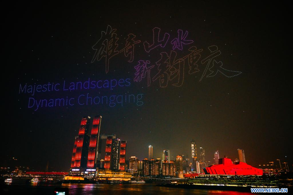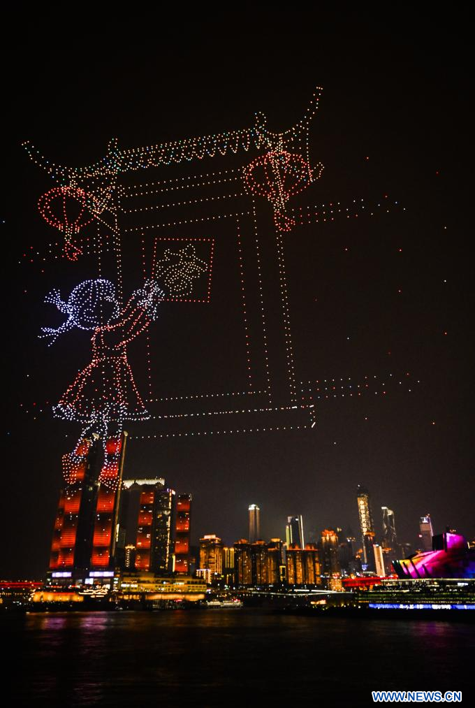 CHONGQING, 19 février (Xinhua) -- Un spectacle de lumières par drone ayant pour thème "Paysage majestueux, Chongqing dynamique" est présenté dans la municipalité de Chongqing, dans le sud-ouest de la Chine, le 17 février 2026. (Photo : Wang Quanchao)