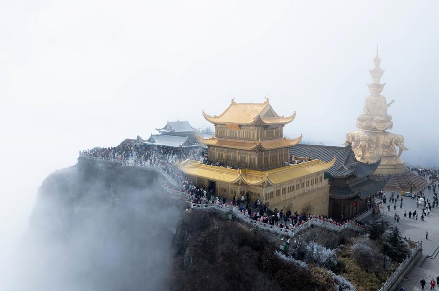 Photo aérienne prise le 20 février 2026 montrant des visiteurs dans la région pittoresque du mont Emei, dans la province du Sichuan, dans le sud-ouest de la Chine. (Photo : Jiang Hongjing)