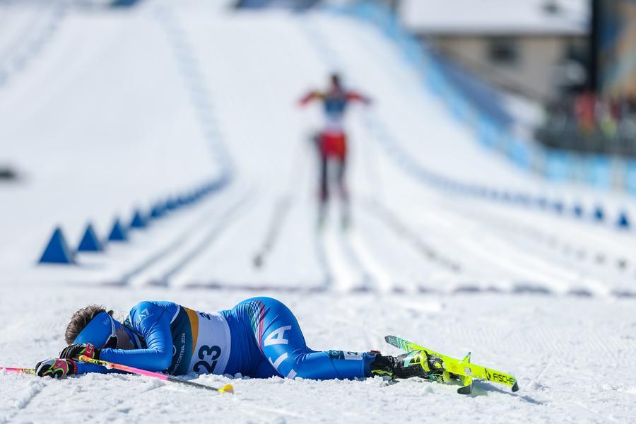 TESERO, 22 février (Xinhua) -- L'Italienne Anna Comarella est allongée dans la neige après avoir franchi la ligne d'arrivée lors de l'épreuve de ski de fond 50 km classique départ en ligne femmes aux Jeux olympiques d'hiver de Milan-Cortina 2026, à Tesero, en Italie, le 22 février 2026. (Xinhua/Huang Wei)