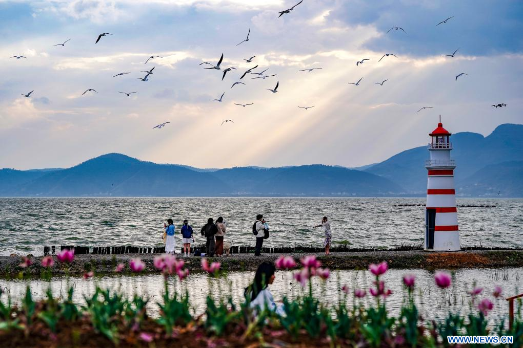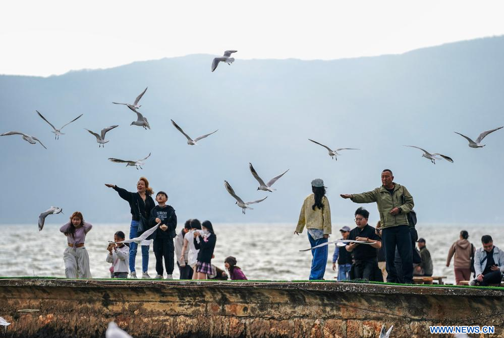 KUNMING, 27 février (Xinhua) -- Des touristes nourrissent des mouettes rieuses au bord du lac Dianchi, dans la ville de Kunming de la province du Yunnan, dans le sud-ouest de la Chine, le 26 février 2026. (Photo : Chen Xinbo)