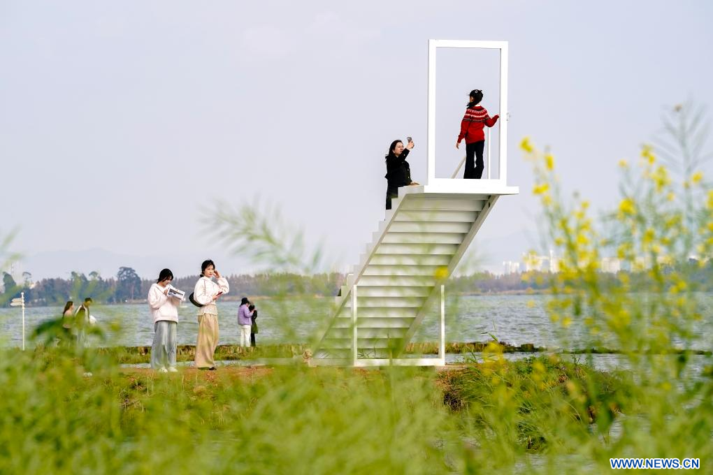 KUNMING, 27 février (Xinhua) -- Des touristes prennent des photos sur une installation au bord du lac Dianchi, dans la ville de Kunming de la province du Yunnan, dans le sud-ouest de la Chine, le 26 février 2026. (Photo : Chen Xinbo)