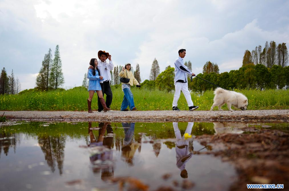 KUNMING, 27 février (Xinhua) -- Des touristes promènent leur chien au bord du lac Dianchi, dans la ville de Kunming de la province du Yunnan, dans le sud-ouest de la Chine, le 26 février 2026. (Photo : Chen Xinbo)