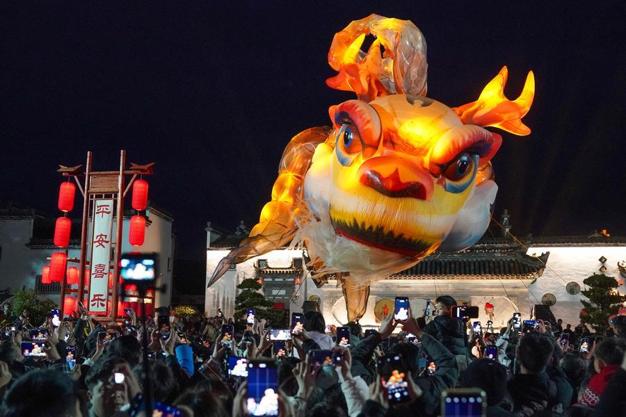 HUANGSHAN, 1er mars (Xinhua) -- Le défilé de lanternes a été organisé vendredi à Huangshan pour célébrer la prochaine fête des Lanternes, mettant en vedette le poisson Ao, une créature mythique chinoise avec une tête de dragon et un corps de poisson.
