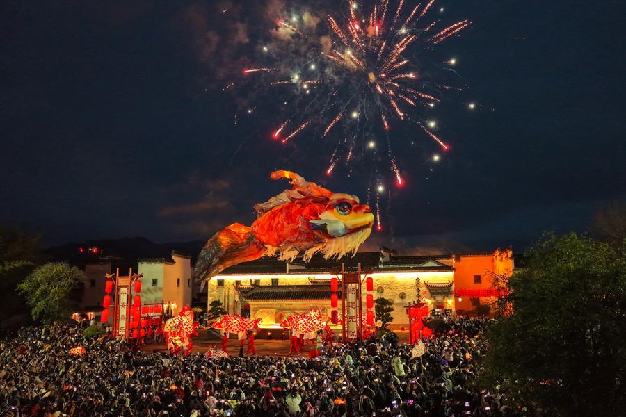 Des spectateurs assistent à un défilé de lanternes en formation de poisson Ao dans le vieux bourg de Tangmo à Huangshan, ville de la province chinoise de l'Anhui (est), le 27 février 2026. (Photo : Du Yu)
