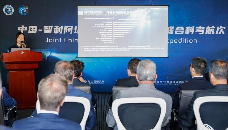 Photo prise le 5 mars 2026 montrant le submersible habité en eaux profondes Fendouzhe à bord du navire de recherche Tansuo-1 dans le port de Valparaiso, au Chili. La réception de clôture de l'expédition conjointe Chine-Chili dans la fosse d'Atacama s'est tenue jeudi à Valparaiso. (Xinhua/Zhou Jiayi)Du Mengran, co-directrice scientifique de l'expédition conjointe Chine-Chili dans la fosse d'Atacama à bord du navire de recherche chinois Tansuo-1, s'exprime lors d'une réception de clôture de l'expédition dans le port de Valparaiso, au Chili, le 5 mars 2026. (Xinhua/Zhou Jiayi)Photo aérienne prise par drone le 5 mars 2026 montrant le navire de recherche Tansuo-1 dans le port de Valparaiso, au Chili. (Xinhua/Victor Garate)■