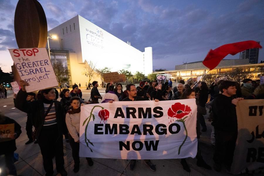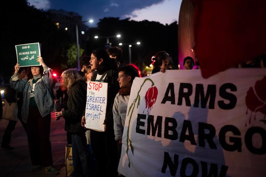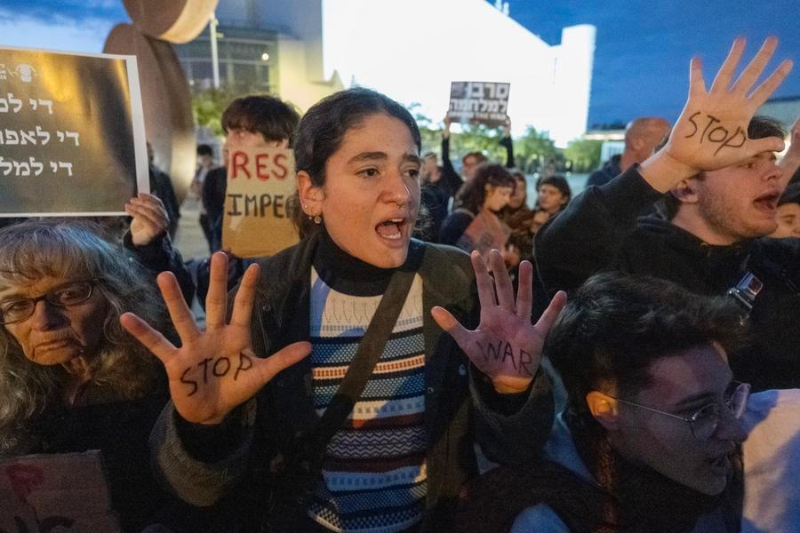 TEL-AVIV, 8 mars (Xinhua) -- Des personnes participent à un rassemblement sur une place pour protester contre les attaques militaires américaines et israéliennes contre l'Iran et exiger la fin immédiate de tous les actes de guerre, à Tel-Aviv, en Israël, le 7 mars 2026. (Xinhua/Jamal Awad)