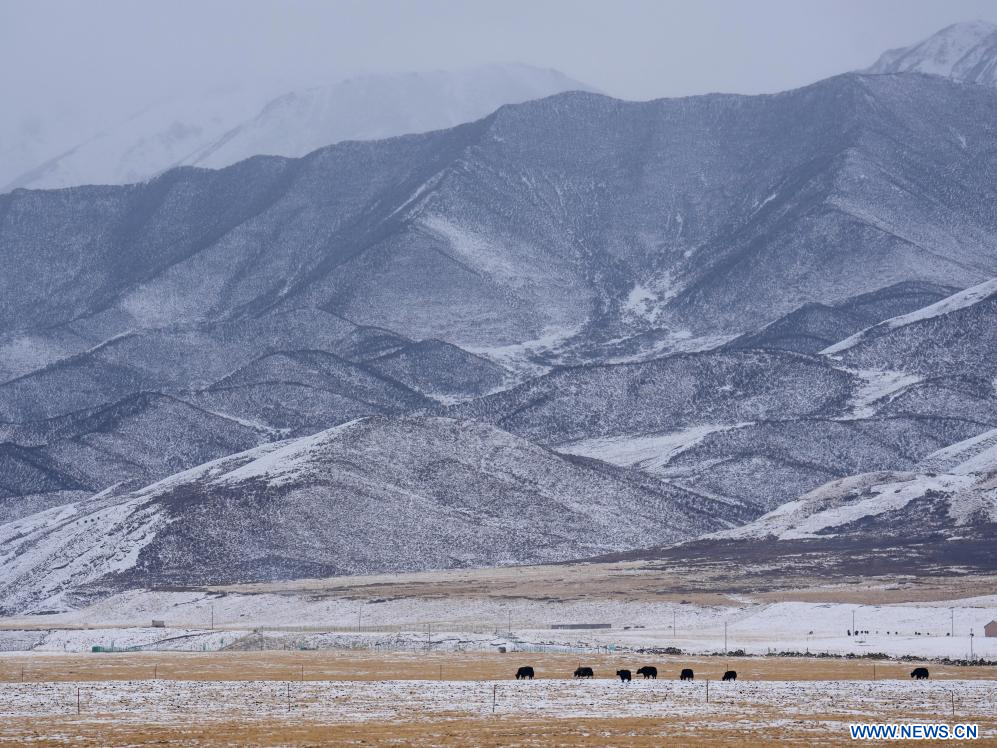 QILIAN, 9 mars (Xinhua) -- Un troupeau de yaks paît dans la neige dans le district de Qilian, dans la préfecture autonome tibétaine de Haibei, dans la province chinoise du Qinghai (nord-ouest), le 8 mars 2026. (Photo : Zhang Long)