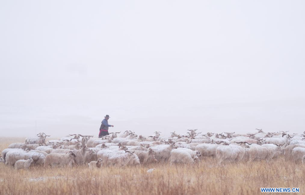 QILIAN, 9 mars (Xinhua) -- Un berger garde son troupeau dans la neige dans le district de Qilian, dans la préfecture autonome tibétaine de Haibei, dans la province chinoise du Qinghai (nord-ouest), le 8 mars 2026. (Photo : Zhang Long)