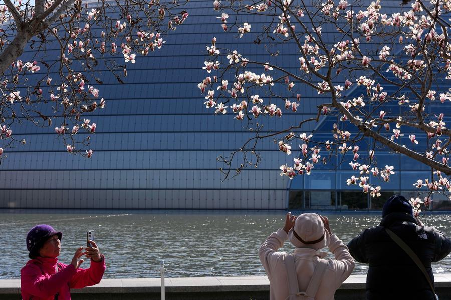Des visiteurs admirent les fleurs de magnolia près du Centre national des arts du spectacle à Beijing, capitale chinoise, le 9 mars 2026. (Photo : Ju Huanzong)