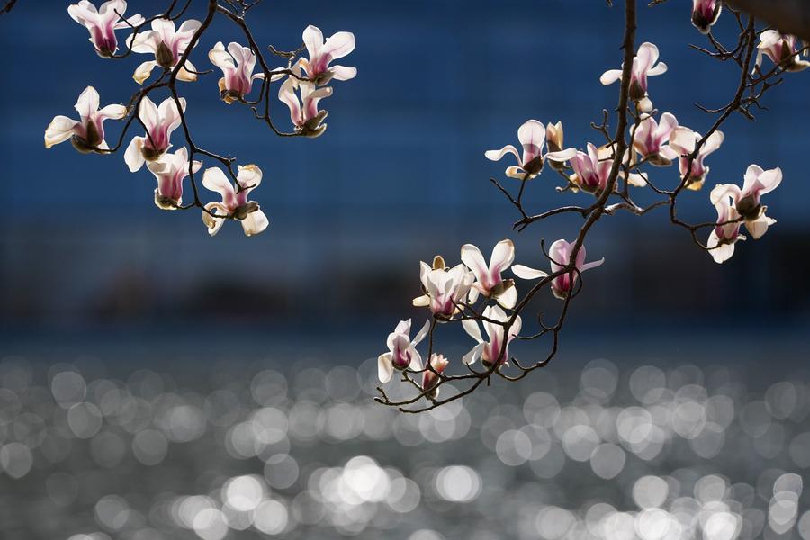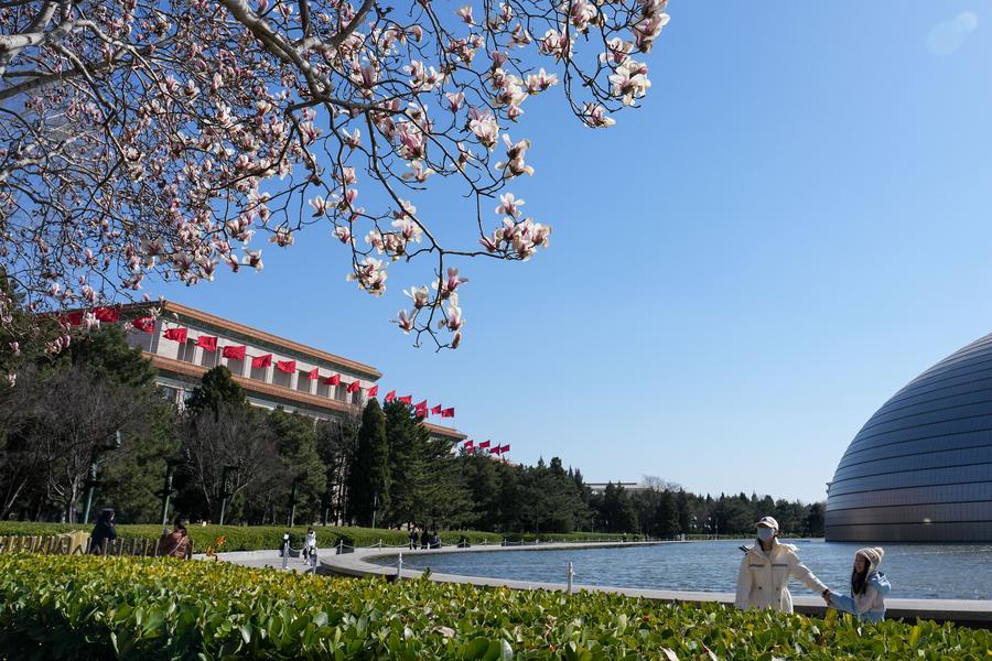 BEIJING, 10 mars (Xinhua) -- Des fleurs de magnolia près du Centre national des arts du spectacle à Beijing, capitale chinoise, le 9 mars 2026.
