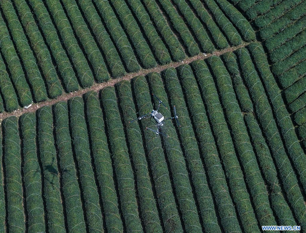WUYI, 11 mars (Xinhua) -- Un drone agricole fertilise un jardin de thé dans le district de Wuyi, à Jinhua, ville de la province chinoise du Zhejiang (est), le 10 mars 2026.